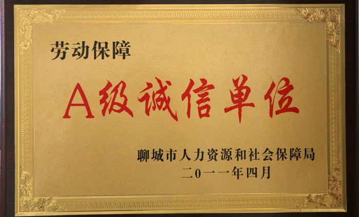 In the 2010 annual labor security credit rating evaluation conducted by the municipal Bureau of Human resources and Social Security, the company was rated as A class A credit unit (labor security credit demonstration unit) for its integrity and law-abiding, standardized management and harmonious labor relations, which was awarded the honor again since it was rated as A class A credit unit in 2009.